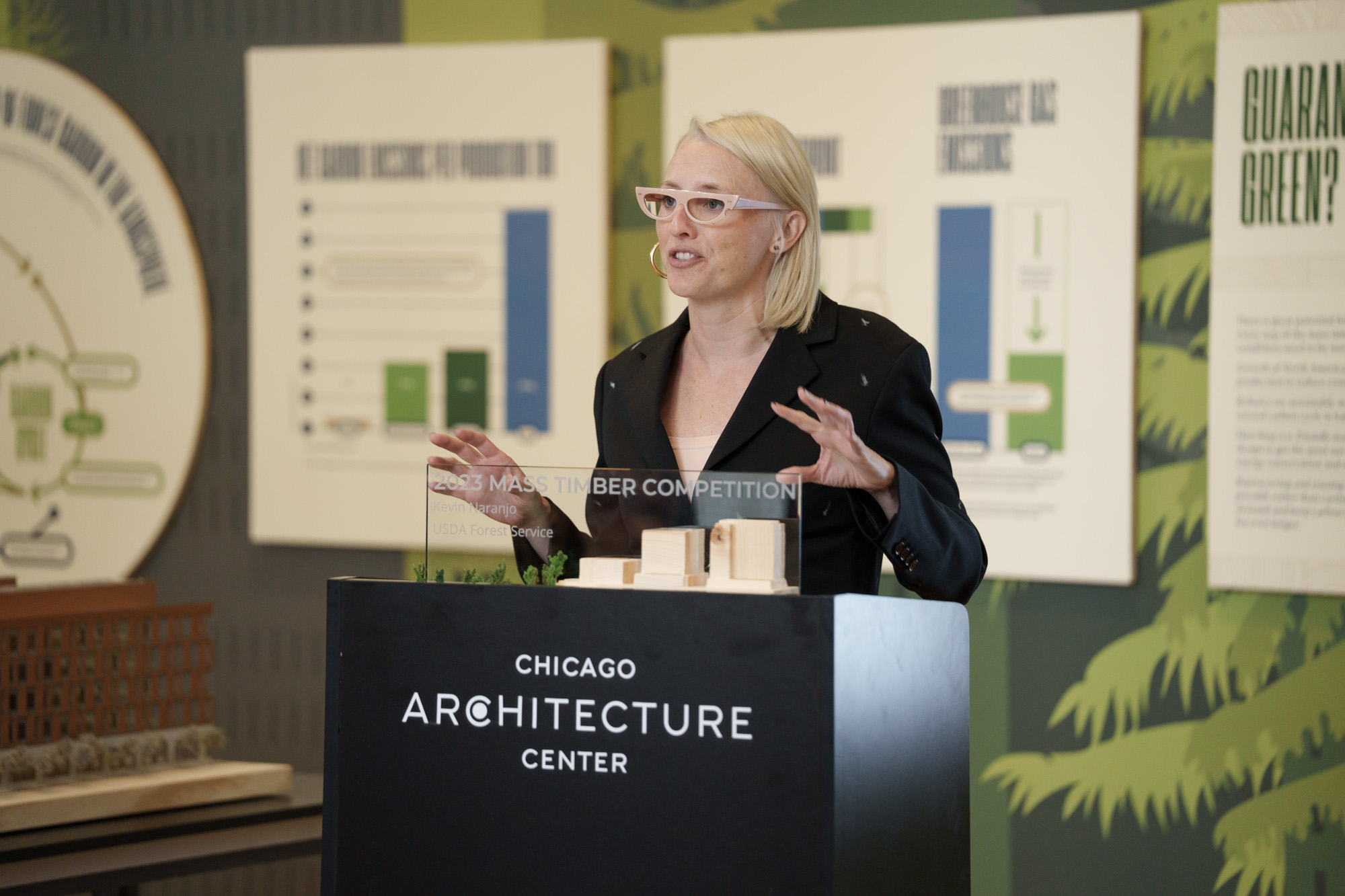 Jury member, Jennifer Bonner participates in awards ceremony for the Mass Timber Competition at the Chicago Architecture Center with the Softwood Lumber Board.