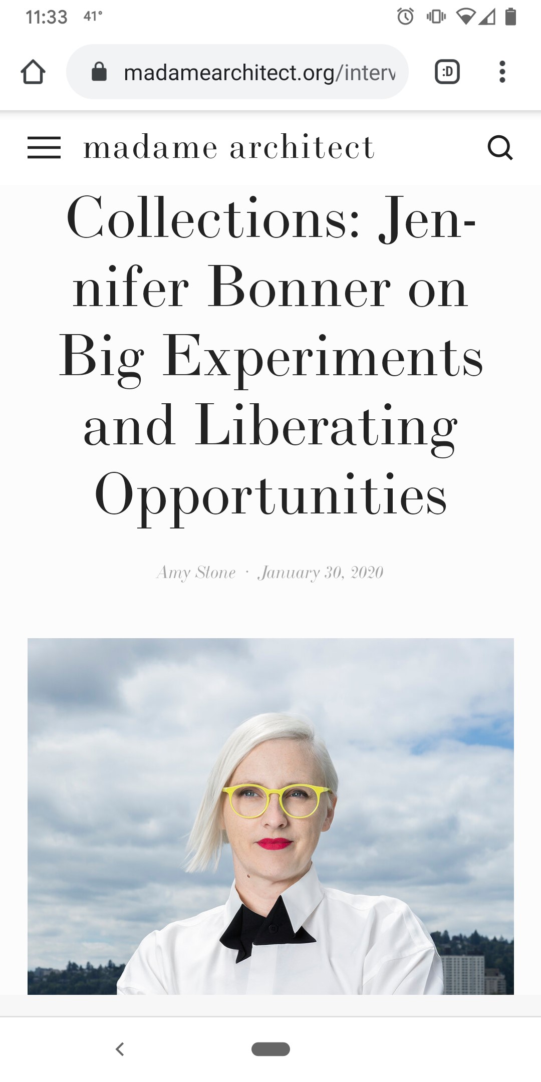 March 2020 > Jennifer Bonner participates in an interview as part of “Building Practice,” a professional elective course at Syracuse University School of Architecture taught by Molly Hunker and Kyle Miller. On October 17, 2019, Isabella Calidonio and Tanvi Rao, students at Syracuse University, now published as Architect’s Newspaper interview series here.